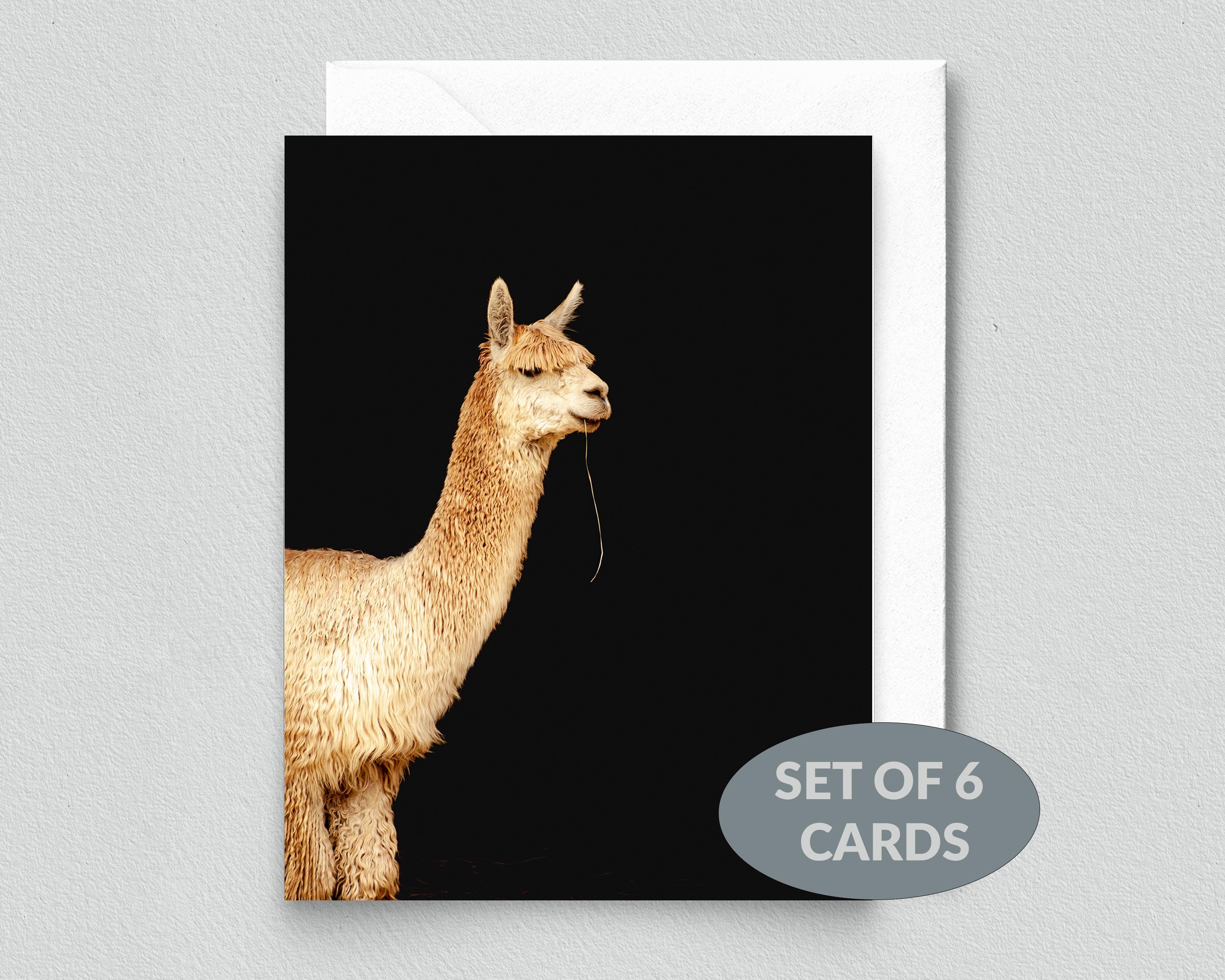 This notecard features Teddy Bear the Alpaca snacking on a piece of straw. Each full-color card is printed with a premium matte finish on heavy cardstock. The inside of the card is blank.