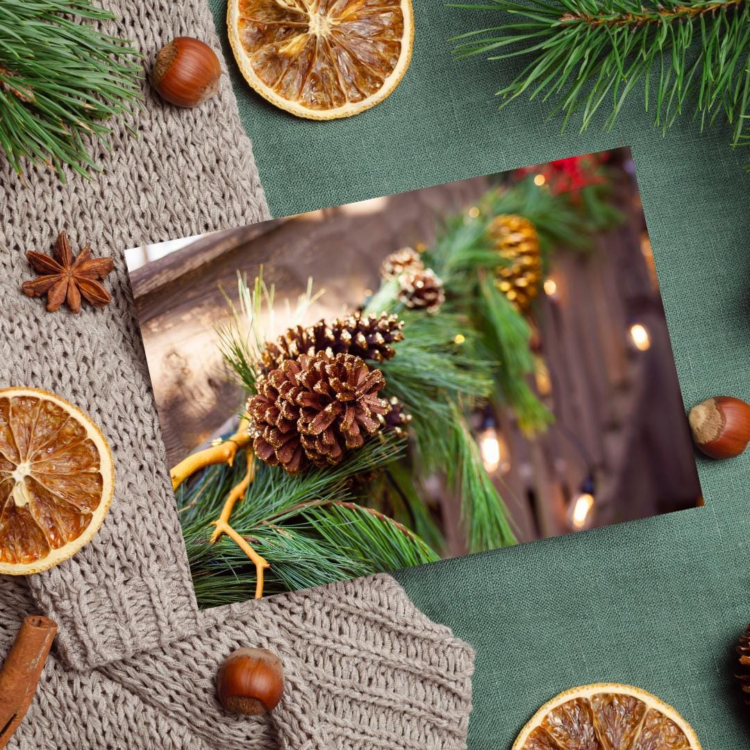 This holiday card features a beautiful spray of pinecone garland. Please note: The inside of the card is blank, leaving ample space to say everything you'd like to say this Holiday Season.